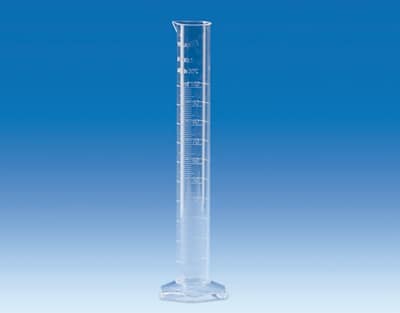 Material: PMP Transparent. With DE-M marking. Class A, high form. With embossed scale and gauges at the main points. Hexagonal foot provides high stability. Exposure to temperatures up to 121°C (autoclaving) does not produce volume variations that permanently exceed the tolerance limit. Tolerance (± ml): 0.50 Division (ml): 1.00 Ø (mm): 27 Height (mm): 200